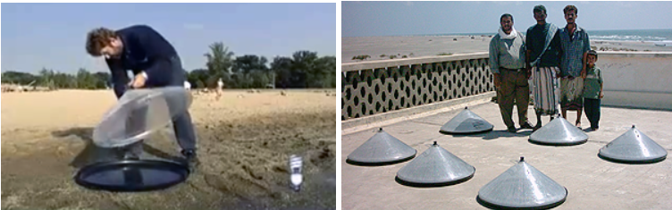 검은색의 바닥판에 오염된 물이나 바닷물을 넣고, 워터콘(water cone)을 덮습니다. 투명한 플라스틱으로 만든 콘(cone) 형상의 워터콘(water cone)을 덮으면, 워터콘(water cone) 내부로 들어온 빛이 온실효과에 의해 내부를 따뜻하게 하면서 수증기가 발생합니다. 검은색의 바닥판은 빛을 흡수하여 워터콘(water cone) 내부를 더 따뜻하게 함으로써 물의 증발이 더 잘 일어나게 합니다.