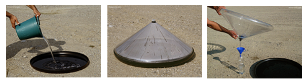 수증기는 오염된 물이나 바닷물로부터 깨끗한 물만 분리된 것입니다. 이 수증기가 워터콘(water cone) 표면에 붙으면서 물방울로 변화하고, 이것이 워터콘(water cone) 바닥에 형성된 오목한 부분에 모이게 됩니다. 하루에 2리터 정도 물이 모인다고 합니다. 다모은 물은 워터콘(water cone)을 거꾸로 들어 밖으로 빼냅니다. 워터콘(water cone)의 꼭지점에 있는 두껑을 열면 깨끗한 물이 나오게 됩니다.