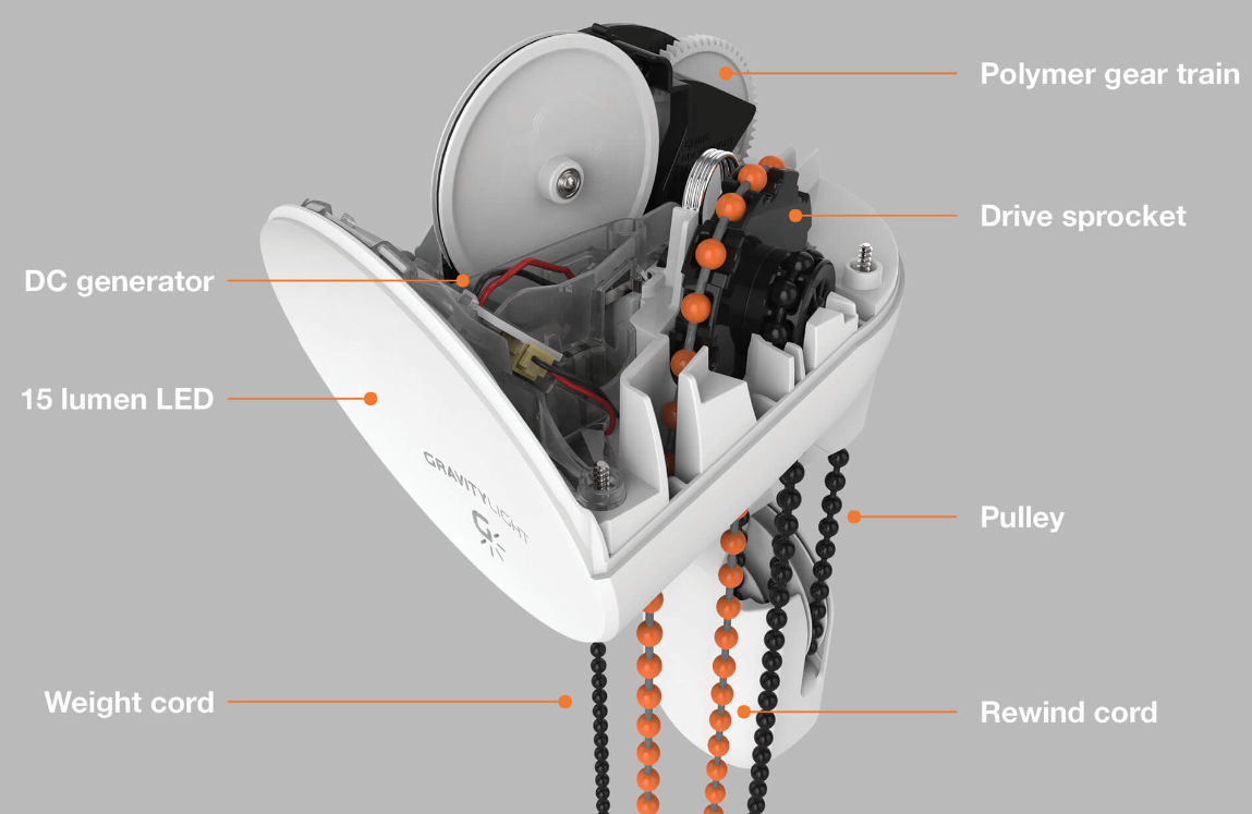 중력 조명(Gravity Lamp)은 발전기(DC generator)에 연결된 줄(weight cord)에 무게가 약 10Kg 정도되는 물건이나 가방을 연결하면, 중력에 의해 줄이 천천히 아래로 내려가면서 발전기를 작동시킵니다.