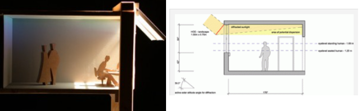 회절판 또는 홀로그램은 빛을 회절시켜 진행하는 방향을 바꾸는 역할을 합니다. 창문에 회절판이나 홀로그램을 필름형태로 만들어 붙이면, 창문을 통과한 빛이 필름에서 회절되어 천장으로 갑니다. 천장과 방안을 밝게 조명합니다(4).