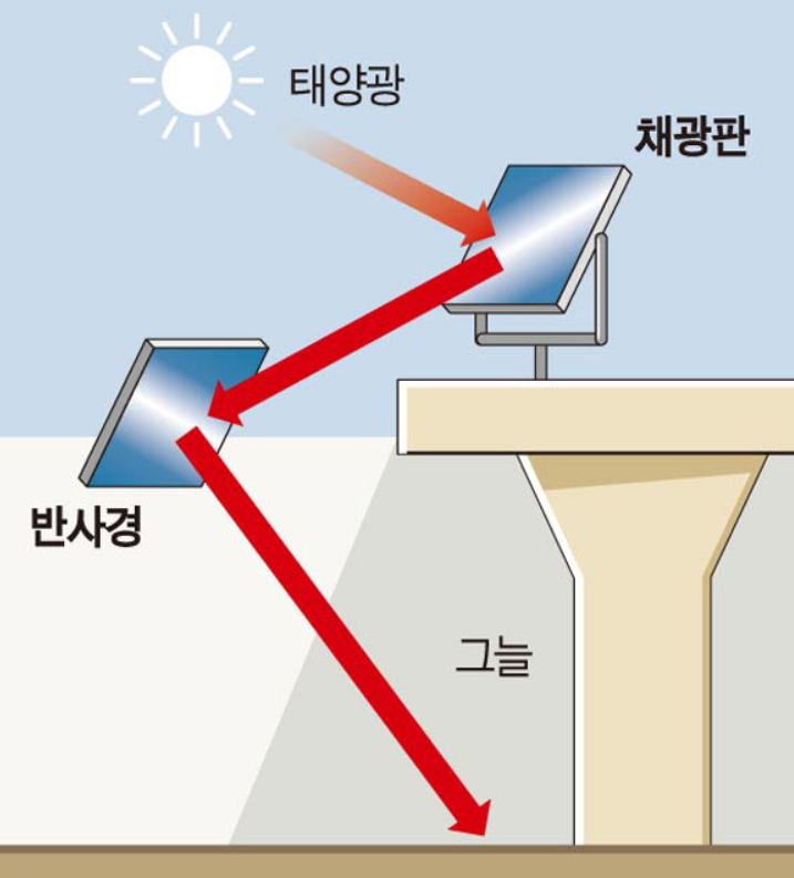 빛은 반사하는 성질이 있습니다. 거울을 이용하여 빛을 반사시켜 건물의 저층이나 지하에 보낼 수 있습니다.