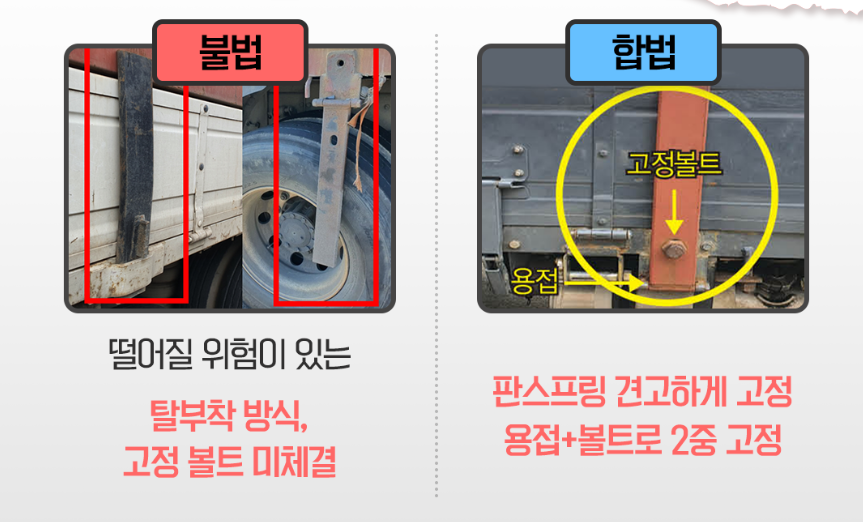 떨어질 위험이 있는 탈부착 방식, 고정 볼트 미체결은 불법이며, 판스프링을 견고하게 고정하고 용접 및 볼트로 2중 고정한 경우는 합법이라고 합니다(1).