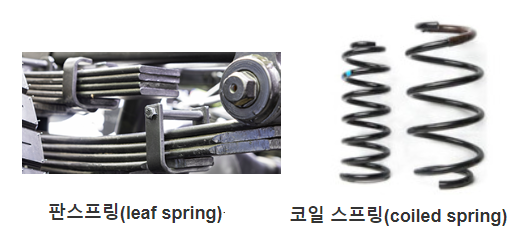 판스프링(leaf spring)은 진동 흡수 기능은 적지만 큰 무게를 지탱할 수 있어서 트럭, 화물차 같은 비교적 큰 차에 사용되고, 코일 스프링(coiled spring) 은 큰 무게를 지탱하기는 어렵지만 진동 흡수 기능이 커서 작은 자동차에 주로 사용됩니다.