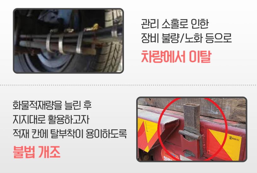 판스프링(leaf spring)에 의한 사고는 관리소홀로 인한 장비 불량과 노화 등으로 차량에서 이탈하거나 화물 적재량을 늘린 후 지지대로 활용하고자 적재 칸에 탈부착이 용이하도록 불법 개조 한 것으로부터 발생합니다.